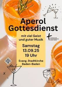 Die Evangelische Kirchengemeinde Baden-Baden lädt herzlich ein zu ihrem 2. Aperol-Gottesdienst in der Evangelischen Stadtkirche am Augustaplatz am Samstag, 13. September 2025 um 19 Uhr. „An diesem Abend feiern wir“, freut sich Dekan Christian Link. „Wir haben den Geschmack des Sommers auf den Lippen, beschwingte Musik in den Ohren und spüren wohltuende Worte der Bibel in unseren Seelen“.
