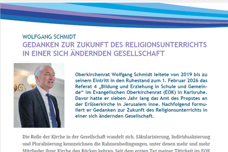 Oberkirchenrat Wolfgang Schmidt leitete von 2019 bis zu seinem Eintritt in den Ruhestand zum 31. Februar 2026 das Referat 4 "Bildung und Erziehung in Schule und Gemeinde" im Evangelischen Oberkirchenrat in Karlsruhe. Für den neuesten RUndbrief aus dem Schuldekanat Baden-Baden und Rastatt formulierte er seine Gedanken zur Zukunft des Religionsunterrichts in einer sich ändernden Gesellschaft.