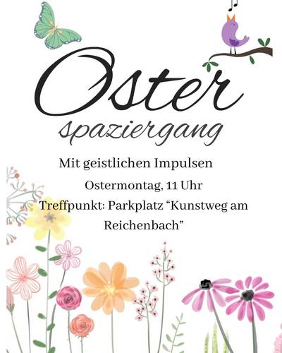 11 Uhr, Kunst, Natur und Besinnung beim Osterspaziergang entlang des Reichenbachs - Treffpunkt: an der Infotafel „Kunstweg am Reichenbach“. Auch Familien sind herzlich willkommen, der Weg ist auch mit Kinderwagen gut befahrbar.