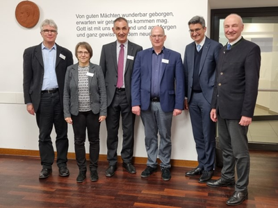v.l.n.r.: Dr. Ulrich Zimmermann und Ute Müller (Bezirkssynode), der wiedergewählte Schuldekan Dr. Helmut Mödritzer, Dekan Christian Link, Prälat Dr. Marc Witzenbacher und Oberkirchenrat Wolfgang Schmidt. Foto: Gabriele Leoff