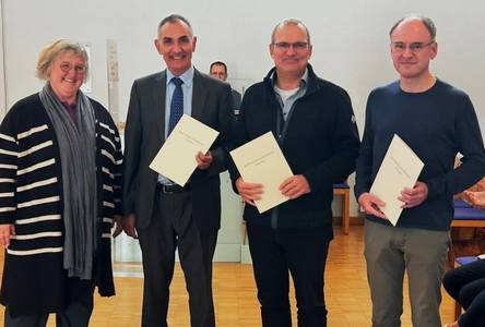 Helmut Mödritzer (2.v.l.) wurde im März 2024 von der Bezirkssynode für eine dritte Amtszeit als Schuldekan des Kirchenbezirks Baden-Baden und Rastatt wiedergewählt. Im Rahmen des Abschlussgottesdienstes der Herbsttagung der badischen (Schul)Dekanatekonferenz empfing er aus den Händen von Landesbischöfin Heike Springhart seine Wiederberufungsurkunde.